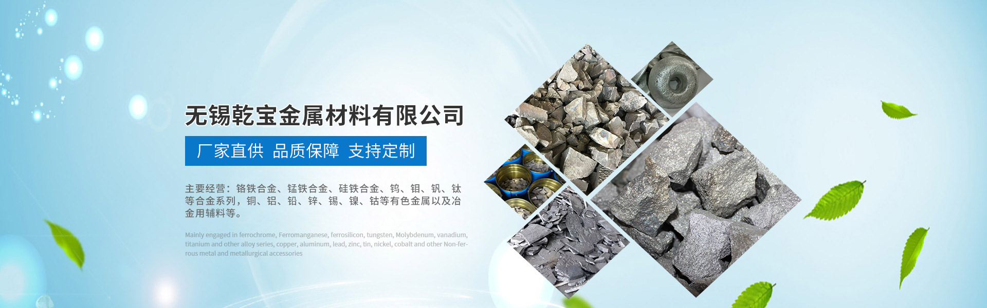 主要經(jīng)營鉻鐵合金、錳鐵合金、硅鐵合金、鎢、鉬、釩、鈦等合金系列, 銅、鋁、鉛、鋅、錫、鎳、鈷等有色金屬以及冶金用輔料等